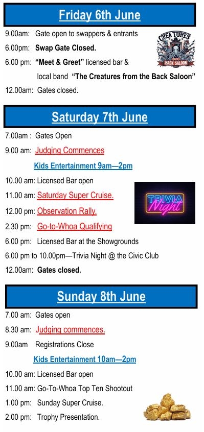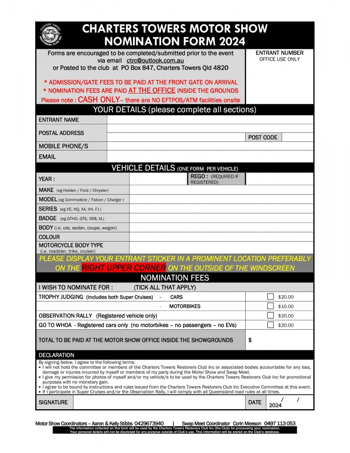 Prepayment of nomination and gate fees are not taken - please arrange to pay at the event and we are a CASH ONLY event - no EFTPOS or ATM facilities are at the Show.