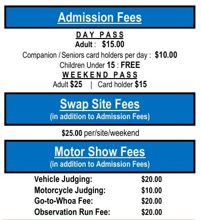 On arrival at the weekend, all entrants and spectators must pay their Admission (or "Gate") fees at the entrance to the Showgrounds. Entrants staying for both days will receive and are required to wear wristbands.